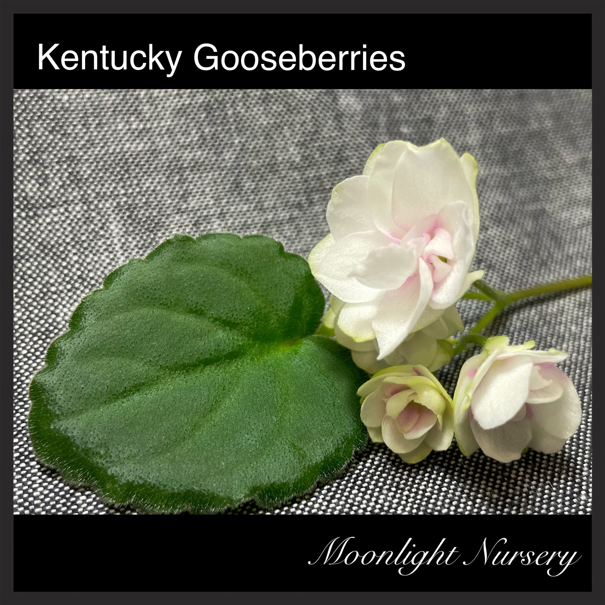 Kentucky Gooseberries (D. Rollins) Double white star/light pink blush. Medium green, serrated. Semiminiature (DAVS 1602)