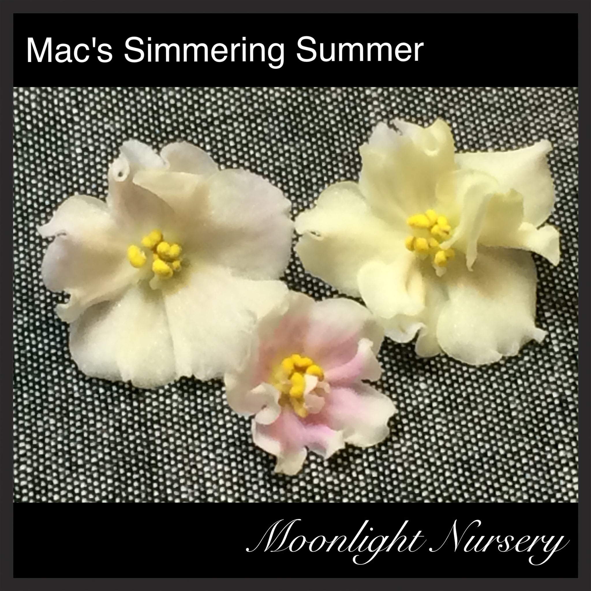 Mac's Simmering Summer (G. McDonald) Single to semi-double creamy yellow star with pink blush. Dark green. Semiminiature (User Database)