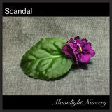 Scandal (7988) 10/08/1993 (S. Sorano) Double dark orchid star/variable darker tips, white edge. Medium green, heart-shaped, quilted, scalloped. Standard
